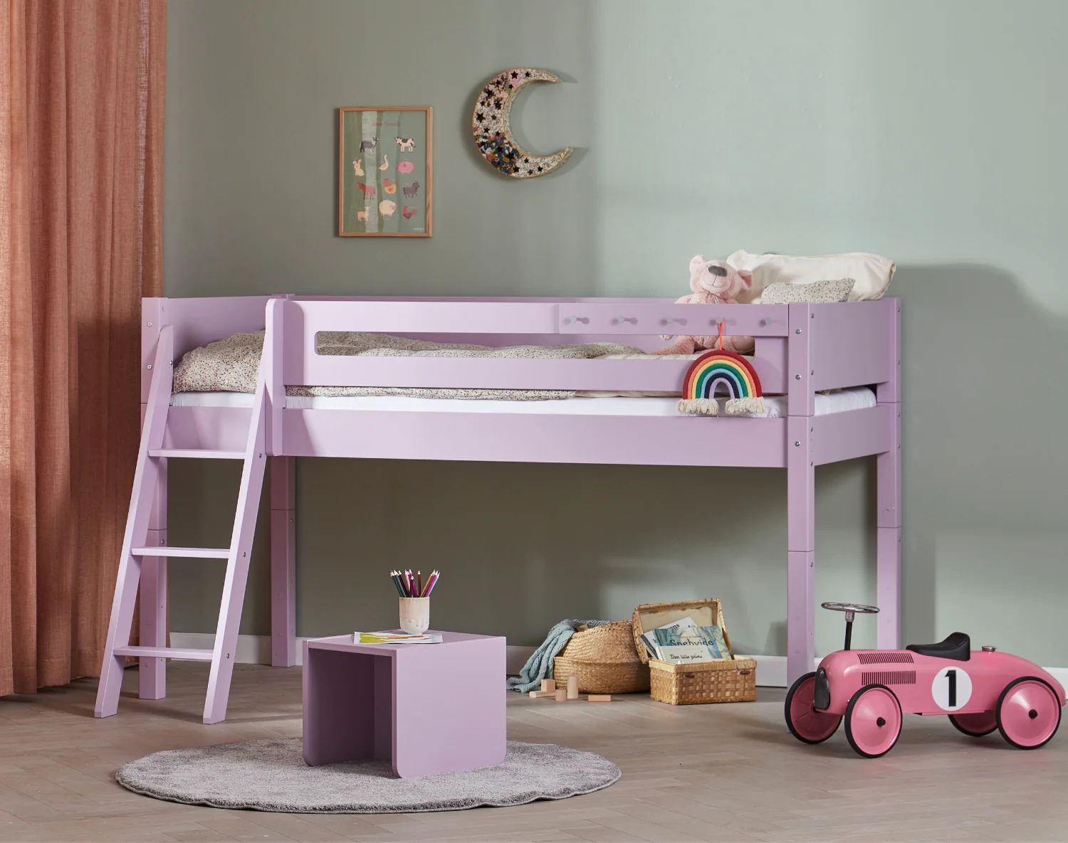Sengen leveres med klatrevæg og en ¾ sengehest, som giver både sikkerhed og åbenhed. Under sengen opstår der plads til leg, opbevaring eller en hyggelig krog, hvor barnet kan fordybe sig og finde ro.