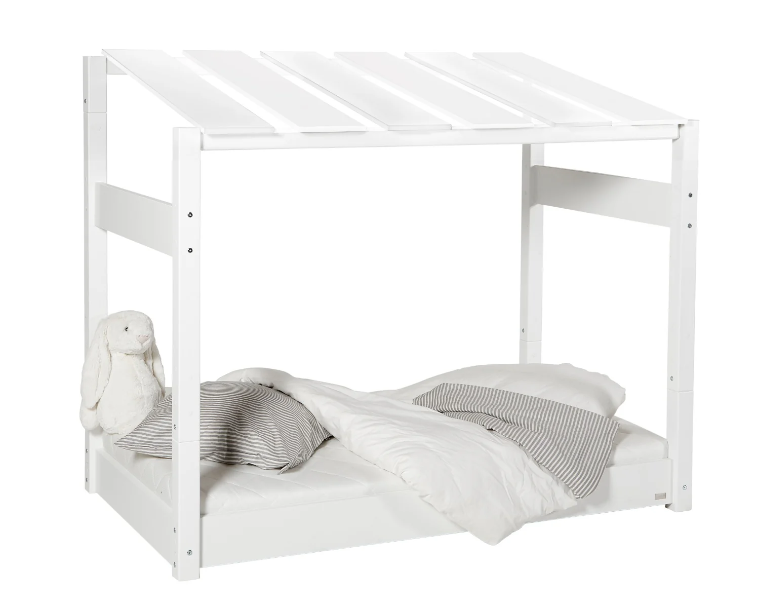 Den lave højde gør det nemt for selv de mindste at kravle ind og ud af sengen, mens den stabile konstruktion giver en tryg base for både søvn og leg. Taget tilfører en blød hulefornemmelse, som inviterer til fantasi og nærvær i hverdagen.