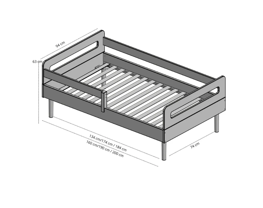 Sengen leveres med robuste ben i naturbøg og fås i et smukt udvalg af farver. Vælg mellem 160 cm, 190 cm eller 200 cm længde – alt efter barnets alder og behov.