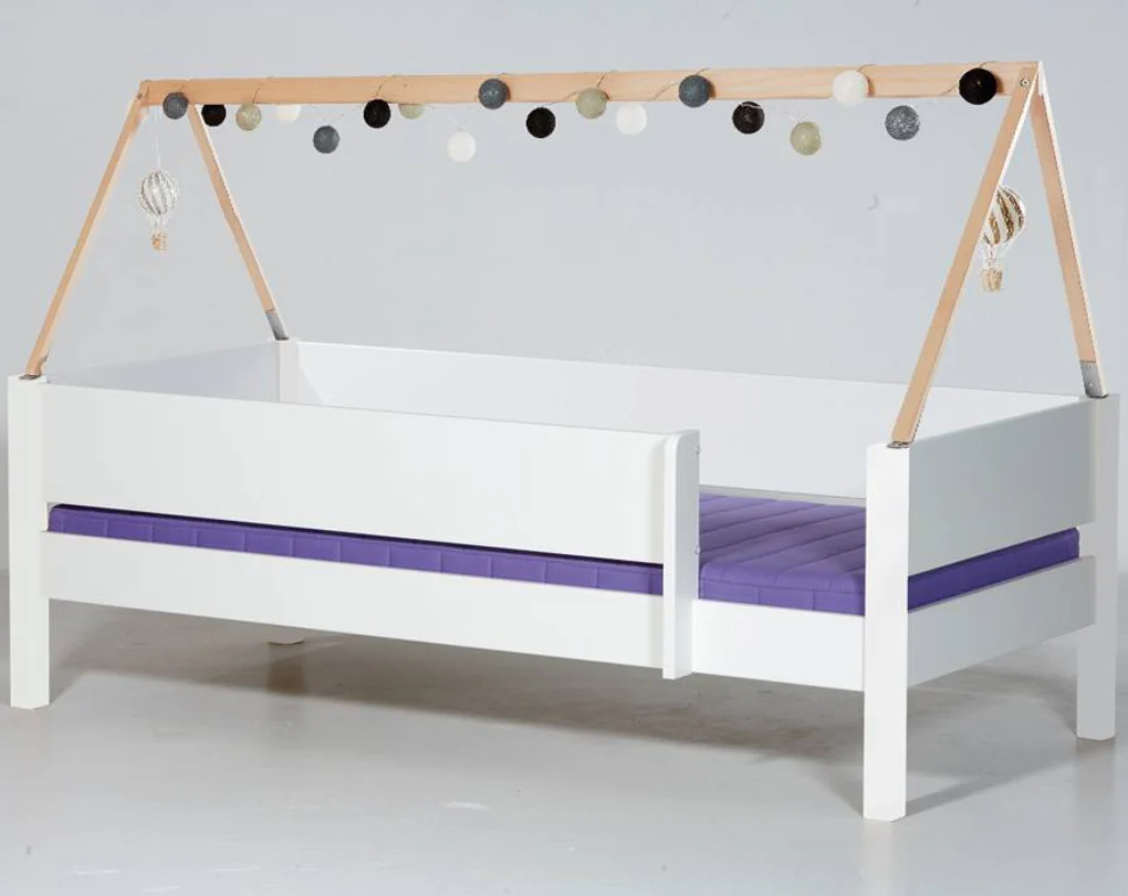 Bøgerammen kan pyntes med lyskæder eller vores bløde bomuldshimmel og giver sengen et let og legende udtryk, der passer naturligt ind i det nordiske børneværelse. En seng, der giver plads til barnets egen verden.